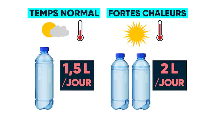 En temps normal, c’est environ 1 litre et demi d’eau par jour. En cas de fortes chaleurs, c’est 2 litres et cela correspond à environ 8 à 10 verres d’eau. Un bon moyen memo-technique pour s’en rappeler équivaut à 1 verre par heure.