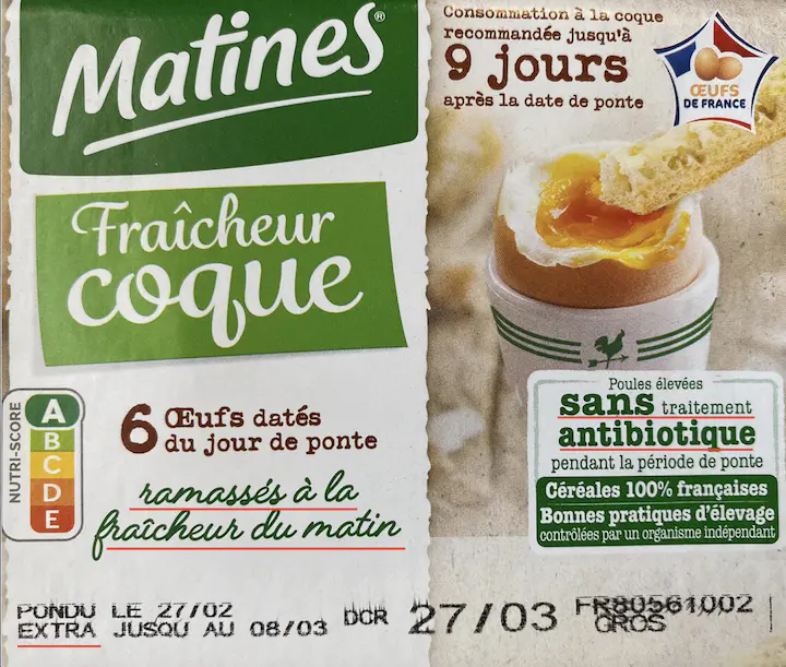 Chez Matines, attention au logo " œufs de France" et aux mentions " ramassés à la fraîcheur du matin", ou "sans traitement antibiotique" … C’est pour freiner l’émergence des résistances aux antibiotiques mais les poules sont toujours élevées en cage.