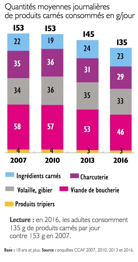 Selon l’étude du Credoc, en 2016, 1% de la population n’avait pas du tout consommé de produits carnés durant la semaine précédant l’enquête, contre 0,3 % en 2007. Les auteurs estiment que ce 1% pourraient correspondre à des individus qui sont soit végétariens soit "flexitariens" (qui limitent volontairement leurs apports carnés).