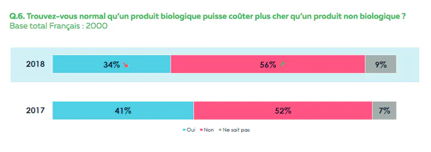 Autre donnée significative relevée par l’Agence bio : la perception du prix des produits issus de l’agriculture biologique. En 2017, 41% estimaient qu’il était normal de payer plus cher de la nourriture bio, alors qu’ils n’étaient plus que 34% en 2018. Le prix est d’ailleurs le premier frein à la consommation de produits bio évoqué par la très grande majorité des personnes interrogées (84%).