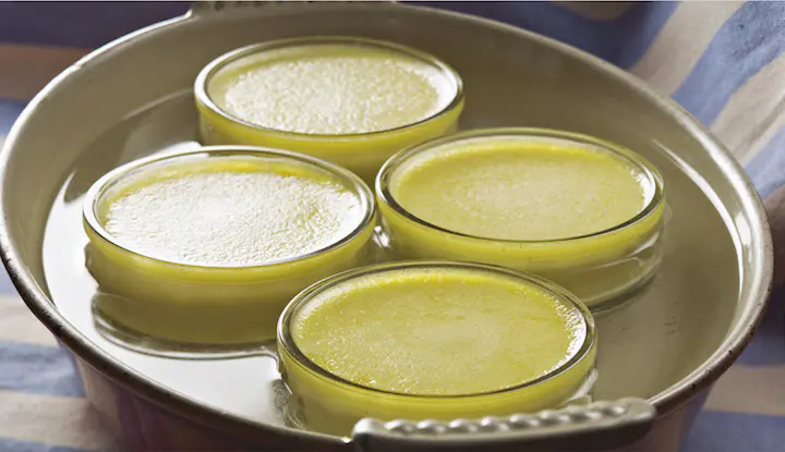 La température doit être douce car il ne faut pas atteindre l’ébullition. La cuisson au bain-marie est idéale pour les crèmes brûlées par exemple ou les œufs au lait. Il ne faut absolument dépasser 80°C pour ces préparations, comme pour la crème anglaise, et ce n’est pas un hasard .