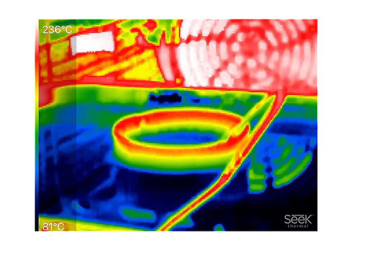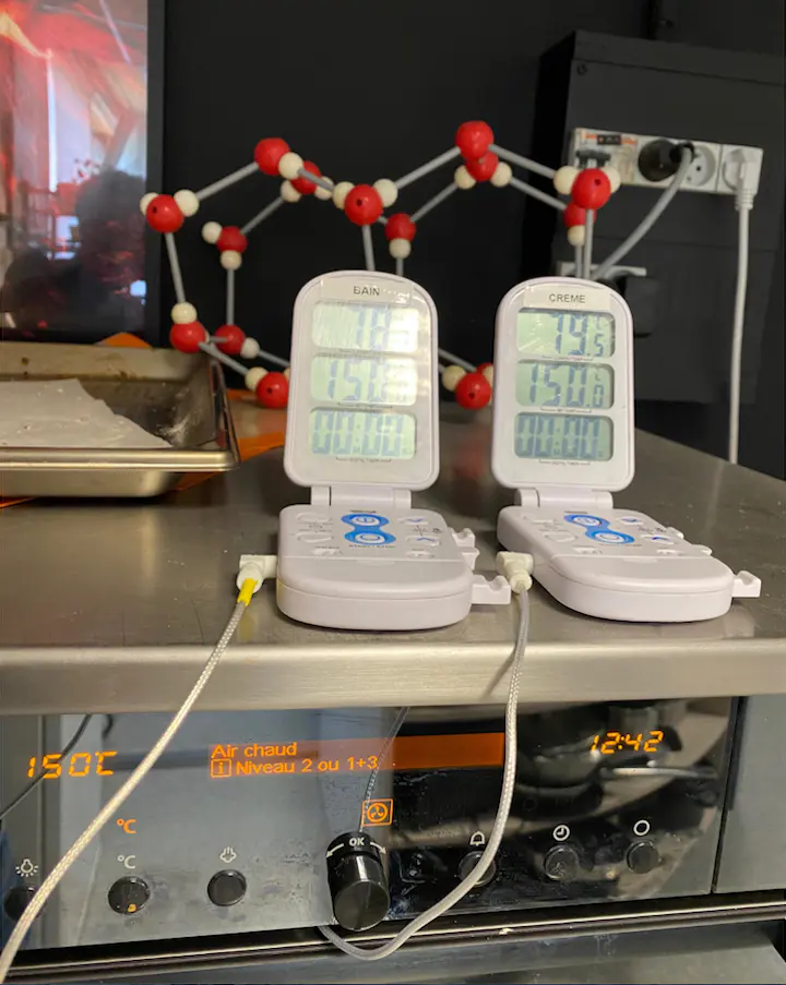 Mettez un pot de crème au bain-marie, avec un thermomètre dans le bain et un thermomètre dans la crème, réglez le four à 150°C et regardez les températures avec le suivi en caméra thermique pour la répartition de la chaleur.