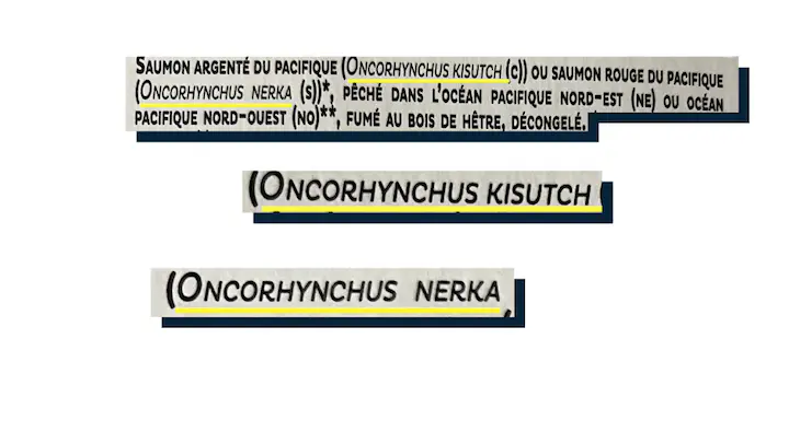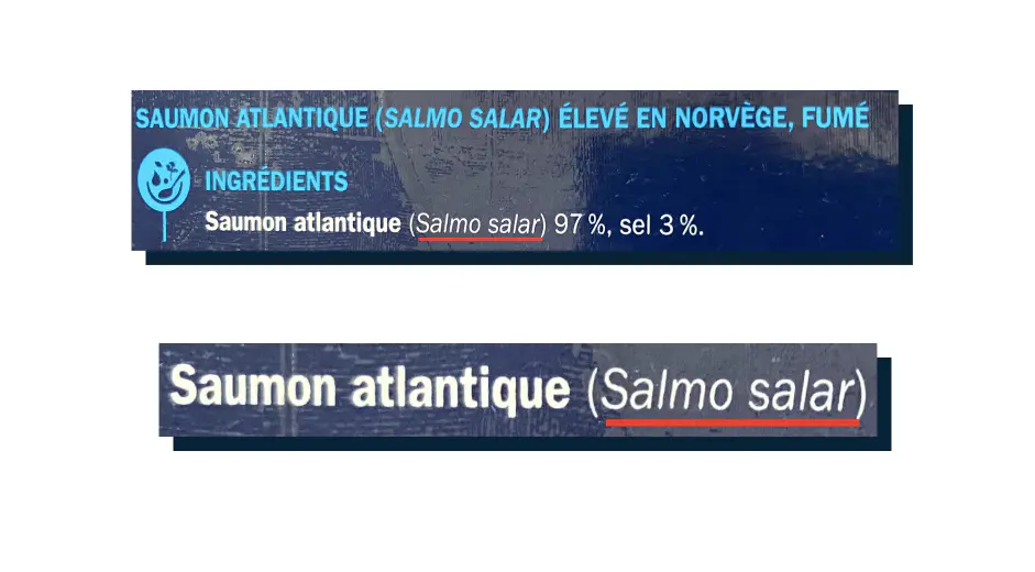 Il faut regarder la provenance. Le saumon atlantique ou saumon de l'Atlantique (Salmo salar) par exemple ne correspond pas du tout à une origine géographique mais à une espèce. Il peut provenir de n’importe quelles côtes de la planète.