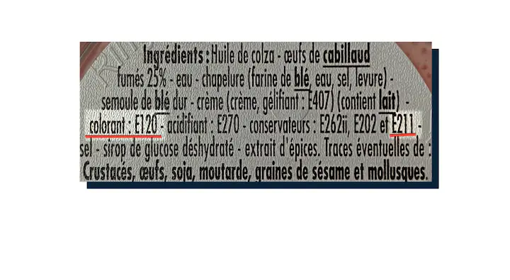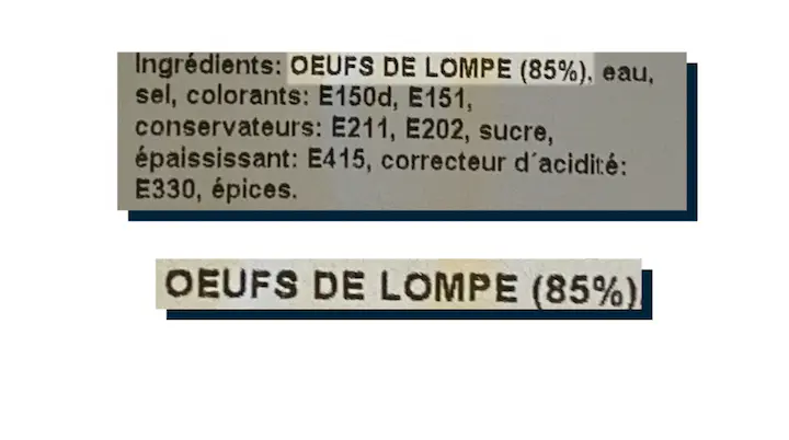 A l’origine, les œufs sont gris, il est donc très étonnant que les industriels y mettent de la couleur. Dans ce cas, il faut préférer les œufs de truite ou de saumon Landvika dans lesquels il y a juste des œufs de poissons et du sel.