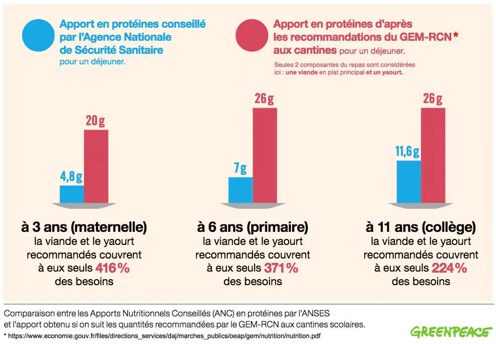 "En ne prenant en compte que la portion de viande du plat principal et le produit laitier, les protéines contenues correspondent à plus de 200 % de l’ANC pour un enfant de 11 ans", observe Greenpeace. "Cela va jusqu’à plus de 400 % pour un enfant de 3 ans. Sur l’ensemble d’un repas […] nous arrivons à plus de 600 % de l’ANC en protéines […] pour un enfant de 6 ans".