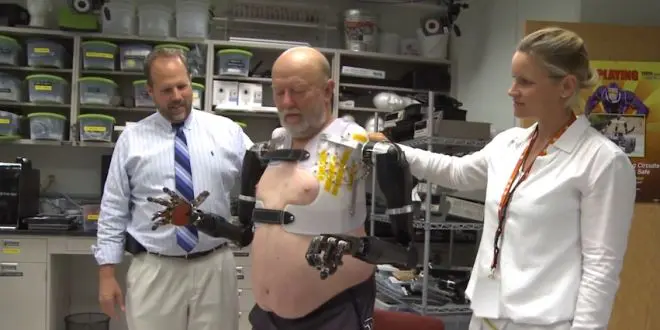 Amputé des bras il y a 40 ans, Leslie Baugh, un habitant du Colorado (Etats-Unis) peut de nouveau saisir des objets "des deux mains", à l'aide d'une double prothèse coordonnée à un logiciel de pointe.