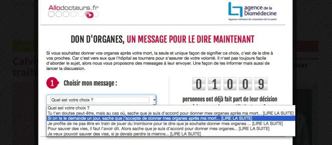 Pour créer l'opportunité d'une discussion, Allodocteurs.fr et l'Agence de la biomédecine proposent aux internautes une plateforme d'envoi de messages. Des mots choisis (et parfois même une pointe d'humour, l'acte de donner n'ayant pas forcément à être austère) pour s'assurer que leurs volontés soient respectées.