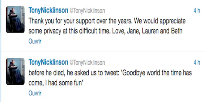 "Goodbye world the time has come, I had some fun" aura été son dernier tweet, relayé par sa famille après sa mort. Tony Nicklinson, un Britannique victime du syndrome d'enfermement (locked-in-syndrome), est décédé à son domicile, mercredi 22 août 2012, six jours après que la justice lui a refusé le droit d'être assisté par un médecin pour mettre fin à ses jours.