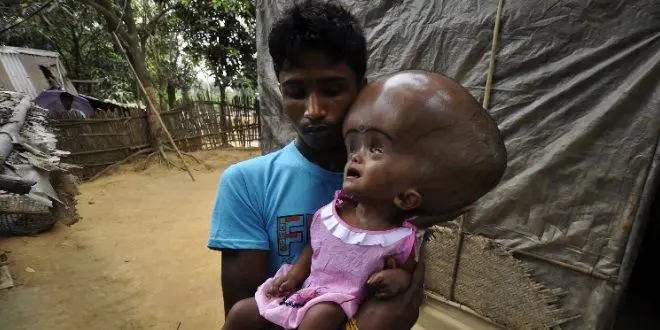 Roona Begum souffrait depuis sa naissance d'une grave anomalie neurologique appelée hydrocéphalie, qui se traduit par l'augmentation du volume des espaces contenant le liquide céphalo-rachidien et provoque une pression sur le cerveau. Avec une circonférence de 91 cm, sa tête était deux fois plus grosse que la normale, ce qui l'empêchait de se tenir droite ou de marcher à quatre pattes.