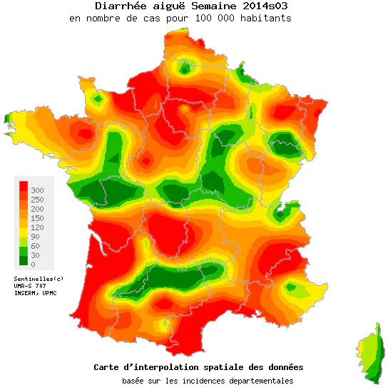 Les régions les plus touchées par la gastro-entérite sont l'Aquitaine (537 cas pour 100.000 habitants), le Limousin (463) et le Languedoc-Roussillon (364).