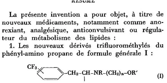 Pourtant un brevet similaire déposé en France le 3 juillet 1967 reprend les utilisations possibles de la molécule : "Ils (les nouveaux dérivés et leurs sels physiologiquement compatibles) peuvent être employés en particulier comme médicaments anorexiant, analgésique, anticonsulsivant (sic) ou régulateur du métabolisme des lipides." Mais il est surtout mentionné à la fin du résumé une proposition de posologie : "L'administration par voie orale, rectale ou parentérale d'un médicament selon 1 à 12, à la dose de 10 à 200 mg, pour le traitement de l'obésité, de la douleur et de l'épilepsie."