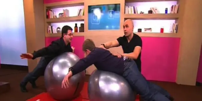 Nordine Attab : "Allongez-vous sur le gros ballon en appui sur le bassin. Jambes tendues, pieds posés par terre. À partir de cette posture, relevez le buste afin qu'il vienne se mettre dans l'axe de vos jambes. Vos bras seront dans un premier temps repliés sur votre poitrine. À partir de cette posture, maintenez la position en statique durant 30 secondes, puis relâchez l'effort.