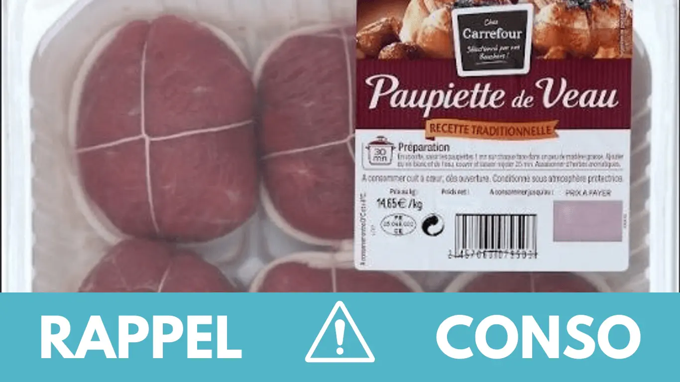 Le rappel consommateur concerne les PAUPIETTES DE VEAU RECETTE TRADITIONNELLE X3 et PAUPIETTES DE VEAU RECETTE TRADITIONNELLE X6 de la marque CARREFOUR SELECTION DE NOS BOUCHERS. Elle sont commercialisées dans les enseignes Carrefour de France entière du 05/11/2025 au 12/11/2025.