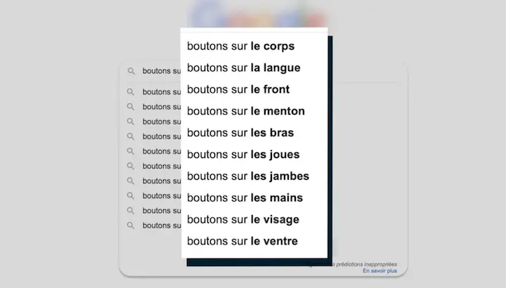 Par contre si vraiment vous recherchez des infos en tapant "boutons sur les fesses", vous obtenez quand même 1 million 700 000 résultats, ce qui vous prouve qu’ils sévissent sur de nombreux fessiers !