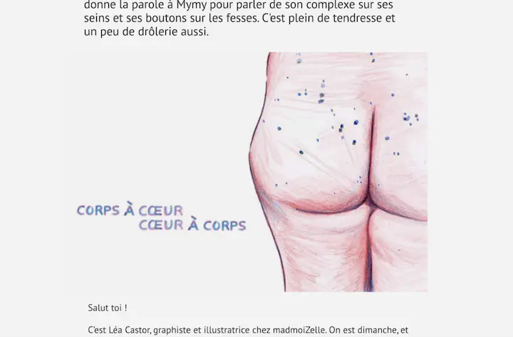 La jeune femme dit à propos de ses fesses : " Sur mes fesses j’ai des boutons (…) et des cicatrices d’anciens boutons. Et ça j’aime pas. J’aimerais avoir les fesses peau de pêche, immaculées à part un ou deux grains de beauté qui donnent envie d’y faire des bisous…mais nan, j’ai des boutons. Pour dépasser ce complexe, j’ai appliqué ma technique préférée. La flemme". Je vous conseille le travail de Léa Castor qui a d’ailleurs publié une BD inspirée de ces témoignages, ça s’appelle "Coeur à corps Corps à coeur" et c’est paru aux éditions Lapin.