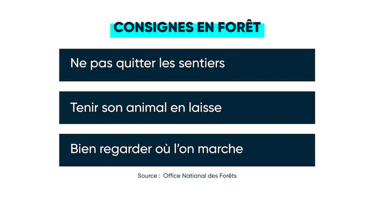 L'office national des forêts demande aux Français et notamment aux Parisiens d’être tout particulièrement vigilants en ce moment. Ils les invitent à respecter des consignes, comme par exemple de ne pas quitter les sentiers, tenir leur animal de compagnie en laisse pour ne pas risquer d’attaquer les oiseaux ou les petits mammifères comme les hérissons, les écureuils etc... et de bien regarder où ils posent les pieds.