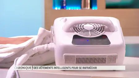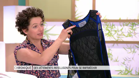 Par exemple, une veste au départ conçue pour des professionnels exposés aux fortes chaleurs promet de vous refroidir. Son mode d'emploi : trempez la veste dans l'eau, 2 à 3 minutes, et essorez-la un peu. Enfilez-la par dessus vos affaires. Le tissu gorgé d'eau restitue l'eau à travers les différentes couches du vêtement. L'eau est ainsi relâchée par évaporation et cela permet de vous rafraîchir. Et vous n'êtes pas trempé, vos habits restent au sec parce qu'il y a une couche imperméable dans la partie intérieure. Avec ce système, vous perdez entre 5 à 8 degrés par rapport à la température ressentie.Cette veste est surtout achetée par les joggeurs, les cyclistes... Elle marche sur une durée de 5 à 10 heures.