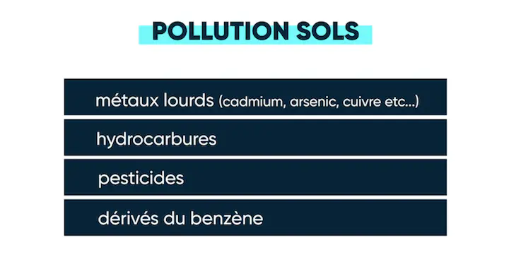 En France, en recoupant les données, les sols sont surtout pollués par les métaux lourds (cadmium, arsenic, cuivre, nickel etc.), puis par les hydrocarbures et leurs dérivés comme les solvants chlorés, et loin derrière par les pesticides divers et variés (à peu près les mêmes que ceux utilisés en agriculture) et les dérivés du benzène.