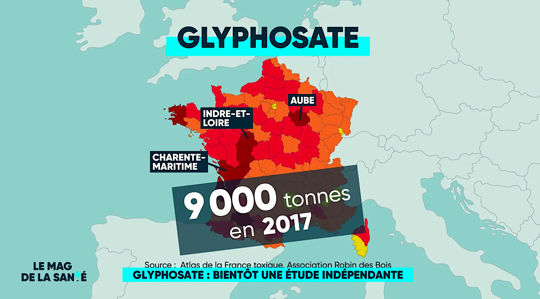 Rym Ben Ameur : "Cela fait des années qu'il y a des craintes sur son impact sanitaire. Dès 2015, la très sérieuse revue "The lancet" évoque des risques de lymphome, mais aussi des effets toxiques sur les reins, le foie et le système hormonal. En mars 2015, le Centre International de Recherches sur le Cancer qui dépend de l'OMS, le classe même "probablement cancérogène". Mais huit mois plus tard, ce verdict est contredit par l'Autorité Européenne de Sécurité des Aliments. Selon elle, il est "improbable" que le glyphosate représente un danger cancérogène pour l'homme. Depuis, plusieurs études sont sorties et elles se contredisent."