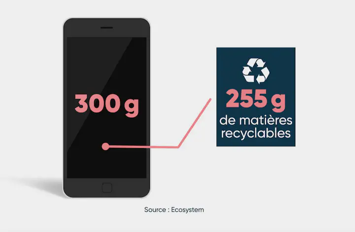 La plupart du temps, ces matériaux peuvent être réutilisés dans de nouveaux téléphones. Un smartphone de 300g contient environ 255g de matières recyclables.