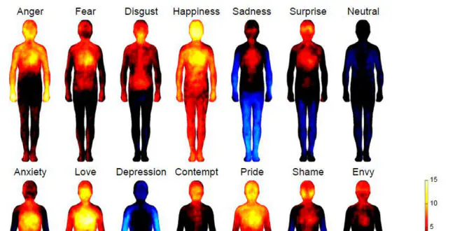 La joie, la tristesse ou encore l'anxiété sont autant d’émotions qui provoquent des changements physiologiques. La sensation de bonheur ou encore le sentiment amoureux envahissent le corps, à l’inverse de la dépression qui l’alourdit et refroidit les membres (jambes, bras et tête). Ces interactions ont fait l’objet d’une étude finlandaise menée sur plus de 700 participants en Finlande, en Suède et à Taïwan. L’expérience vise à dresser la carte du corps selon les émotions. Les résultats ont été publiés dans la revue Proceedings of the National Academy of Sciences.