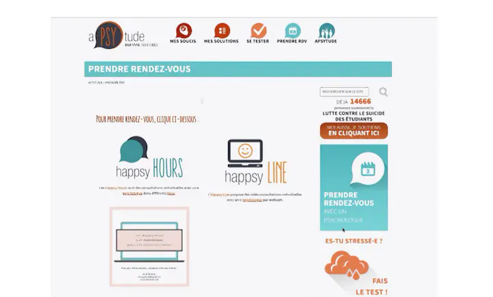 Sur le site, aPSYtude, vous pouvez prendre directement rendez-vous en ligne pour un rdv physique ou en visio avec un professionnel de la santé psychique. Vous pouvez aussi répondre à un test en ligne pour voir ou vous en êtes. Plus d’une cinquantaine de psys collaborent avec l’association qui est présente dans presque toutes les villes de France.