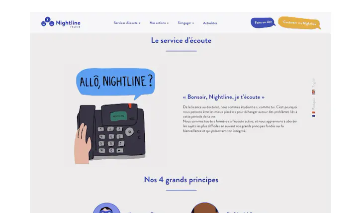 Elle propose des lignes d’appels anonymes et gratuites de nuit, de 21h30 à 2h du matin. Il y a 4 nightline, une à Paris, une à Lille, une à Lyon et une à Saclay. Vous retrouverez les différents numéros sur leur site.