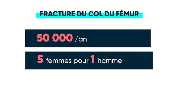 En France on observe environ 50 000 fractures du col du fémur par an. Elle atteint 5 femmes pour un homme.