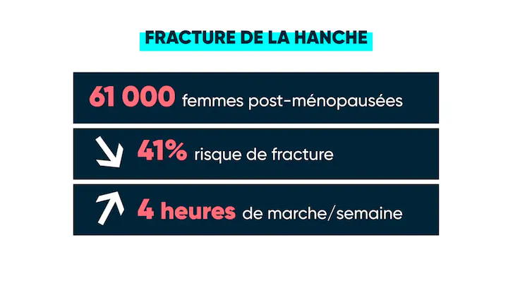 Une étude menée auprès de plus de 61 000 femmes post-ménopausées a observé une diminution de 41 % du risque de fracture de la hanche chez les femmes qui marchent plus de 4 heures par semaine, comparativement à celles qui marchent moins d’une heure.