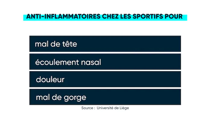 Une étude du service de Santé Publique de l’Université de Liège a rencontré 338 sportifs dans 11 centres de fitness en région liégeoise. Ces sportifs déclarent consommer des médicaments pour lutter contre le mal de tête (42,7 %), l’écoulement nasal (33,3 %), pour contrôler la douleur (27,6 %) ou encore pour lutter contre le mal de gorge (18,7 %).