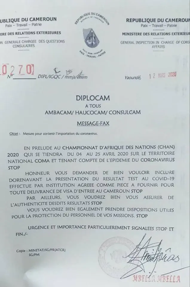 "En prélude au championnat d’Afrique des nations (CHAN) 2020 qui se tiendra du 04 au 25 avril 2020 sur le territoire national et tenant compte de l’épidémie du coronavirus honneur vous demander de bien vouloir inclure dorénavant la présentation du résultat test au COVID-19 effectuée par institution agréée comme pièce à fournir pour toute délivrance de visa d’entrée au Cameroun", écrit le ministre Lejeune Mbella Mbella dans un message-fax envoyé à tous ses collaborateurs.