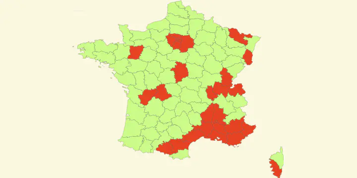 Cela concerne les Hautes-Alpes, l'Aube, la Haute-Corse, le Doubs, l'Eure-et-Loir, la Haute-Garonne, la Gironde, Ille-et-Vilaine, le Lot, le Lot-et-Garonne, le Nord, l'Oise, le Puy-de-Dôme, les Pyrénées-Atlantiques, les Hautes-Pyrénées, les Pyrénées-Orientales, le Bas-Rhin, la Savoie, le Territoire de Belfort, La Réunion et Mayotte.