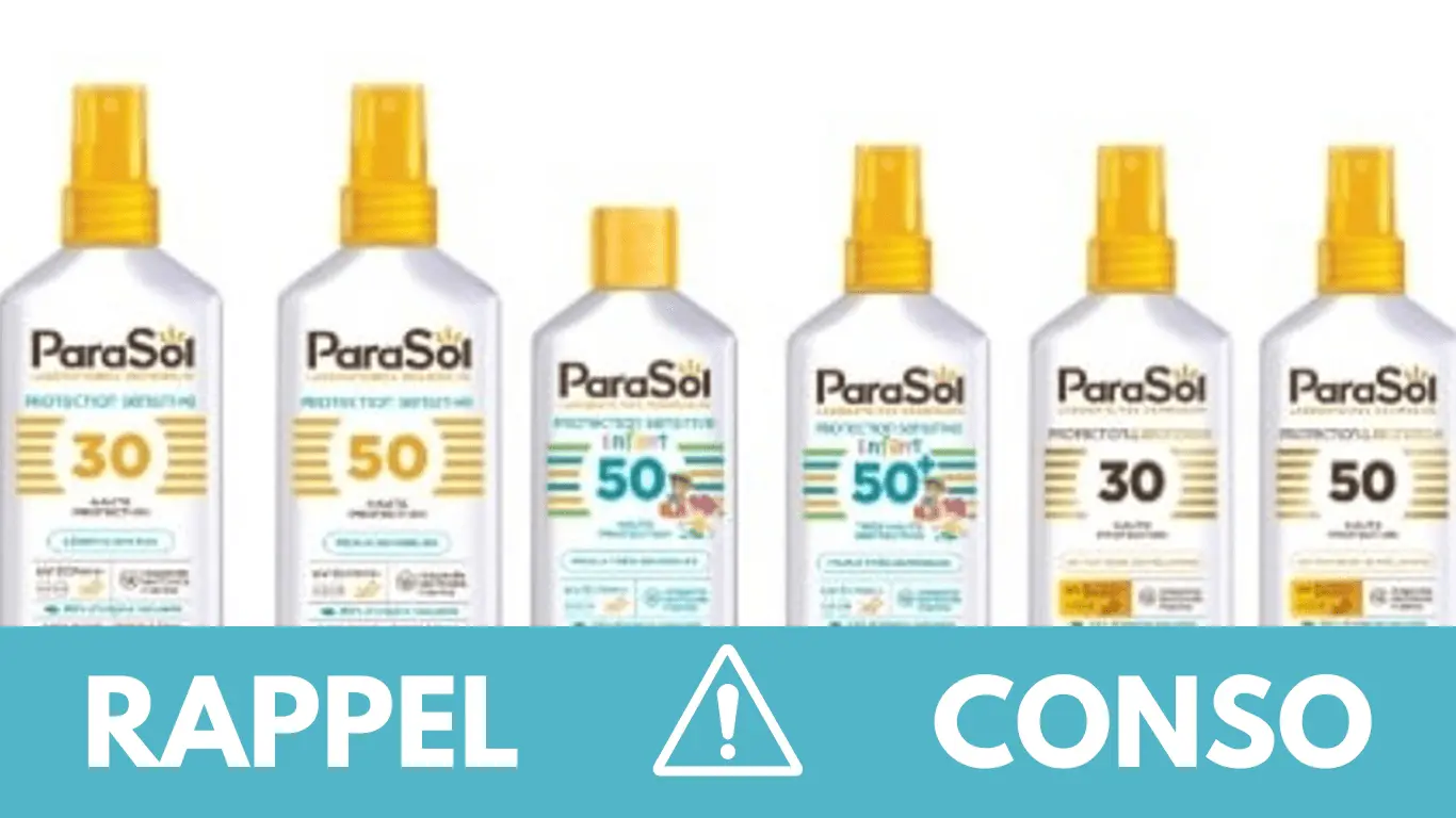 - Spray Sensitive 30, Spray Sensitive 50, Spray 30 Protection&Bronzage, Spray 50 Protection&Bronzage, Lait 50 Enfants, Spray 50+ Enfants, Crème visage Sensitive 50+, Lait Sensitive 50 mini, Spray Sensitive 30 Mini, Spray Sensitive 50 mini de la marque ParaSol. Tous ont été commercialisés dans les enseignes Auchan, Intermarché, U, Carrefour, Leclerc, Casino et magasins de proximités de France entière du 10/03/2024 au 21/05/2025.