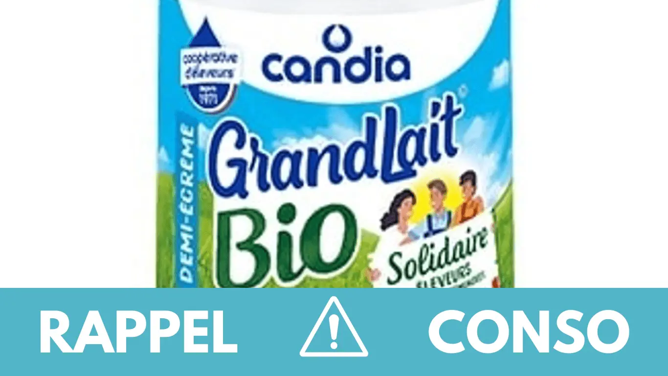 Le rappel consommateur concerne le lait GrandLait demi écrémé bio de la marque Candia vendu en bouteille de 1L en format par 8. Il est commercialisé dans les enseignes Leclerc de France entière.