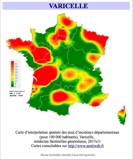 Selon le bulletin hebdomadaire du réseau Sentinelles, la semaine du 13 au 19 mars 2017, le taux d'incidence des cas de varicelle vus en consultation de médecine générale a été estimé à 37 cas pour 100.000 habitants en France métropolitaine.
