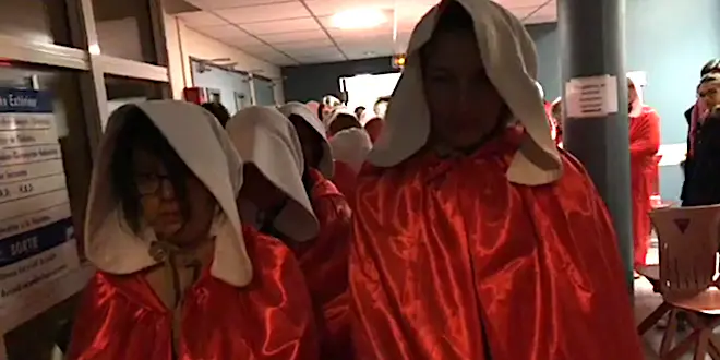 Les femmes portaient la tenue des "servantes écarlates" du roman de Margaret Atwood, devenue le symbole de la privation de droits et de l’oppression des femmes. L’évacuation a été filmée et la vidéo a été postée sur la page Facebook du collectif de défense de la maternité C'est pas demain la veille. En signe de protestation, les occupants ont longuement scandé le slogan "Résistance ! C’est pas fini ! " en quittant les lieux.