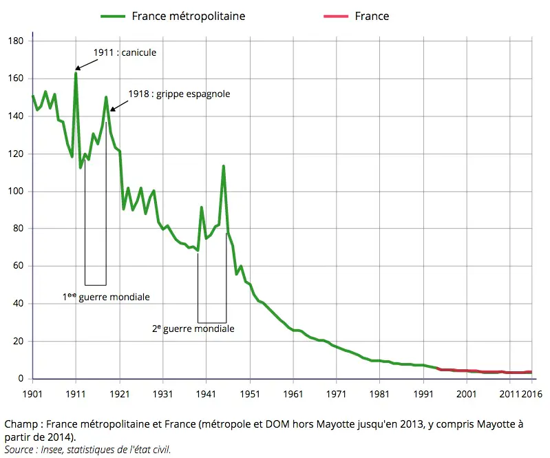 Taux de mortalité infantile pour 1000 naissances vivantes depuis 1901 (source : Insee)