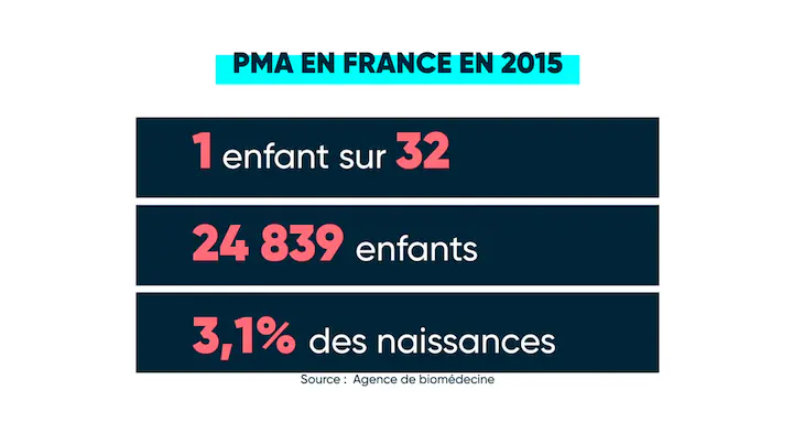 On estime qu'environ 1 enfant sur 30 naît grâce à la PMA chaque année en France, ça représente autour de 25 000 naissances. Soit environ 3% des naissances. Mais il y a beaucoup plus de tentatives, donc le recours à la PMA est courant en France.