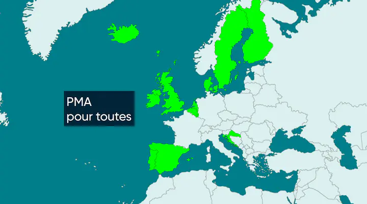 En vert, ce sont les 11 pays européens qui autorisent la PMA à toutes les femmes, par exemple : le Danemark, les Pays-Bas, la Belgique, l’Espagne, le Portugal...