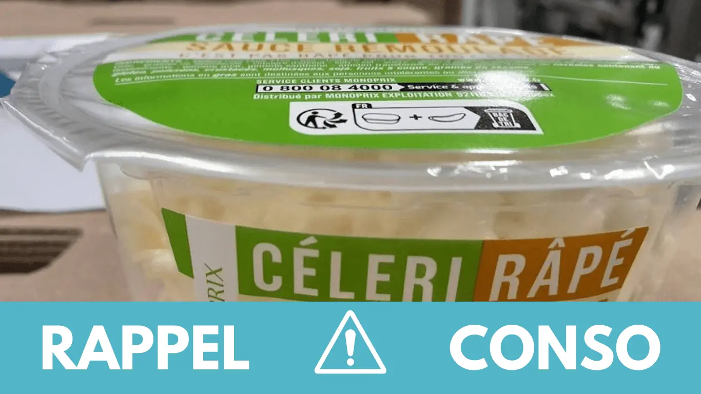- Céleri rémoulade 300g Monoprix de la marque Monoprix commercialisé dans les enseignes MONOPRIX de France entière du 07/05/2025 au 07/05/2025. Il s’agit du lot 3350030181048 512701 / Date limite de consommation 25/05/2025.