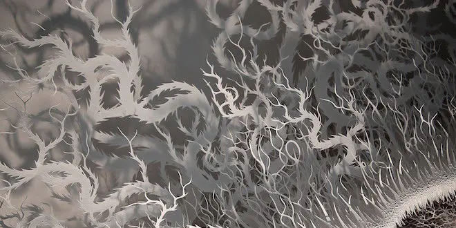 Avec une patience infinie, le britannique Rogan Brown découpe dans le papier des formes délicates inspirées de la nature, allant parfois même jusqu’à copier le profil de bactéries…