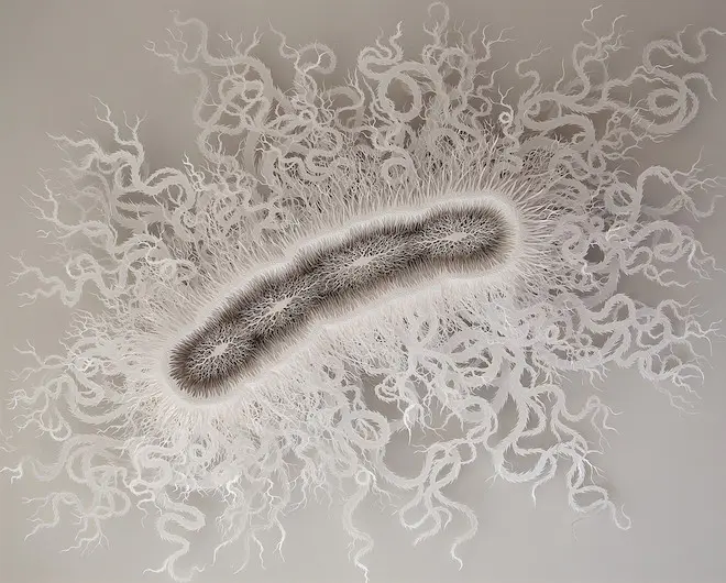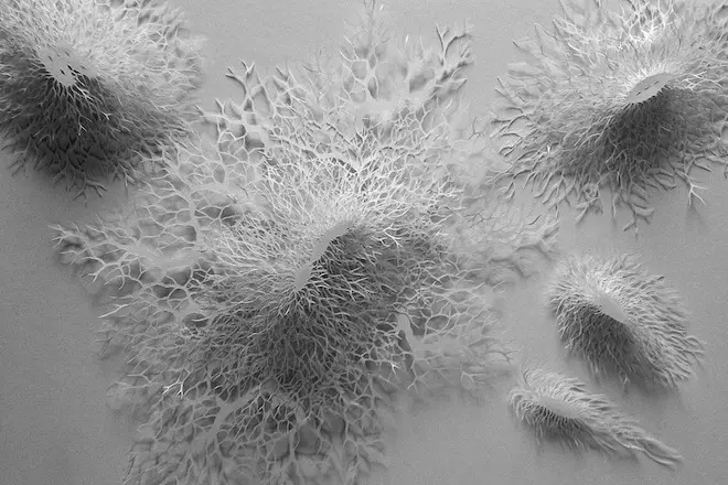 Si la plupart de ses sculptures de papier, fruits de journées entières de ciselage au scalpel, ne renvoient pas à des objets réels, quelques-unes se veulent un reflet presque fidèle du monde microscopique.