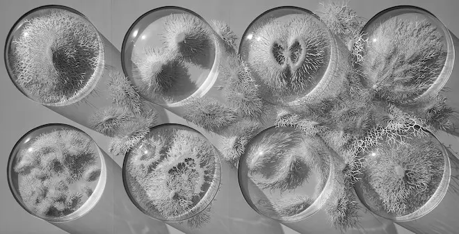 La création ci-dessous a été inspirée par une rencontre avec des microbiologistes spécialistes des bactéries présentes sur notre peau et dans notre corps (le microbiome humain). "Fasciné par ce monde caché, j’ai passé des mois à étudier les formes étranges des microbes et des agents pathogènes. Je voulais créer une œuvre qui interrogerait nos peurs du microbiologique ; voilà pourquoi certaines de ces bactéries semblent s’échapper de boîtes de Petri, avec une énergie féroce et incontrôlable", commente encore l’artiste.