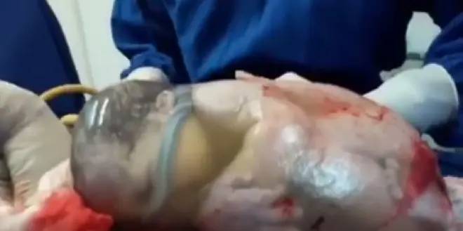 En principe, une femme perd les eaux avant l'accouchement. Mais cette fois, de façon exceptionnelle, un bébé a gardé sa poche de liquide amniotique à la naissance.
