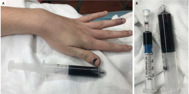 Une Américaine de 25 ans souffrait d’une maladie provoquée par un excès de médicament anesthésique. Sa peau et son sang étaient teintés de bleu à cause d’une chute d’oxygénation de son sang.