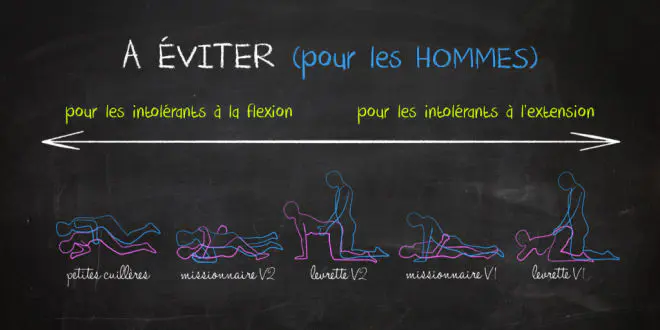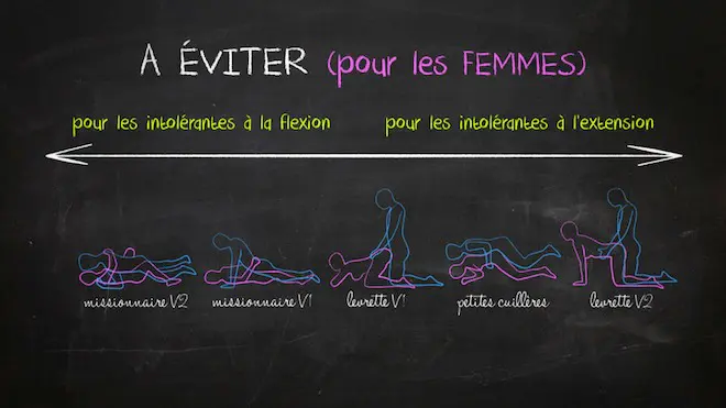 Plus vous êtes sensibles à la flexion (ce qui est la douleur la plus fréquente), plus vous aurez intérêt à privilégier les positions sur la droite du tableau. Inversement, si vos douleurs sont exacerbées à l'extension.