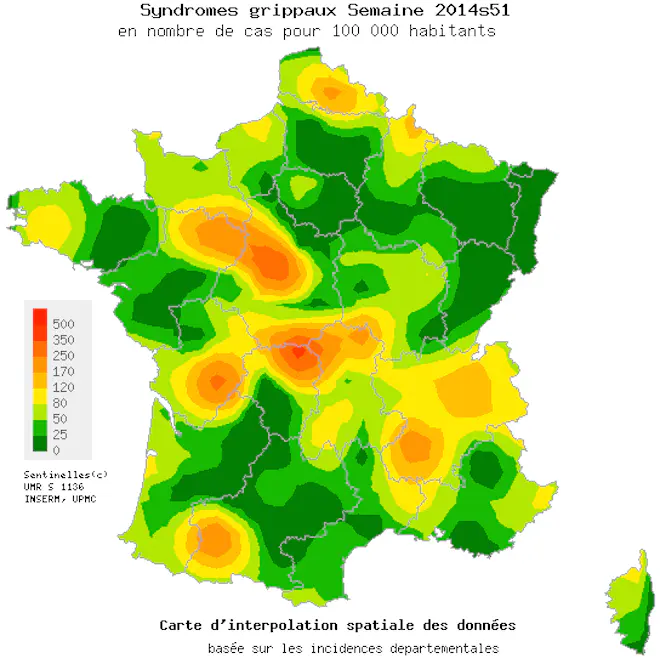 Au niveau régional, les taux d'incidence les plus élevés ont été observés en : Nord-Pas-de-Calais (130 cas pour 100 000 habitants), Rhône-Alpes (123) et Poitou-Charentes (110). Les tableaux cliniques rapportés par les médecins Sentinelles "ne présentaient pas de signe particulier de gravité", "aucune hospitalisation pour syndrome grippal [n'ayant] été rapportée."