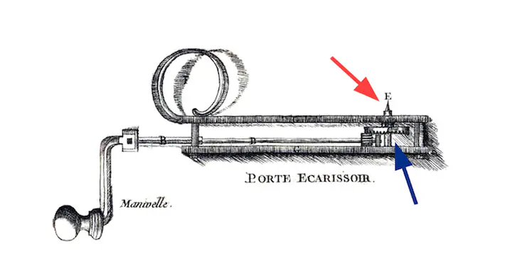 À la fin du XVIIIe siècle, le premier ancêtre de la roulette va apparaitre. Un porte équarrissoir inventé par un dentiste nommé Jourdan. L’équarrissoir est une petite pointe (flèche rouge) qui va pouvoir tourner grâce à un système de roues (flèche bleue) qui s’engrainent, actionné par une manivelle. Jourdan explique que le patient n’a pas besoin d’ouvrir trop grand la bouche pour permettre à l’instrument de pénétrer.