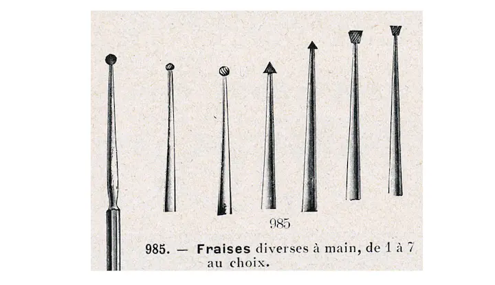 Certains dentistes au milieu du XXe utilisent encore des fraises à tourner à la main. Le moteur à pédale au pied, quant à lui, était encore utilisé pendant la guerre d’Algérie dans les camions aménagés pour soigner les soldats .