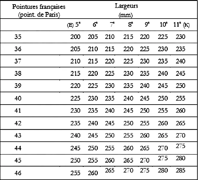 En outre, à chaque pointure correspond en théorie plusieurs largeurs. Là encore, les règles de calculs sont simples [1] ; mais à quoi bon faire le calcul quand les fabricants n’en font jamais mention ?